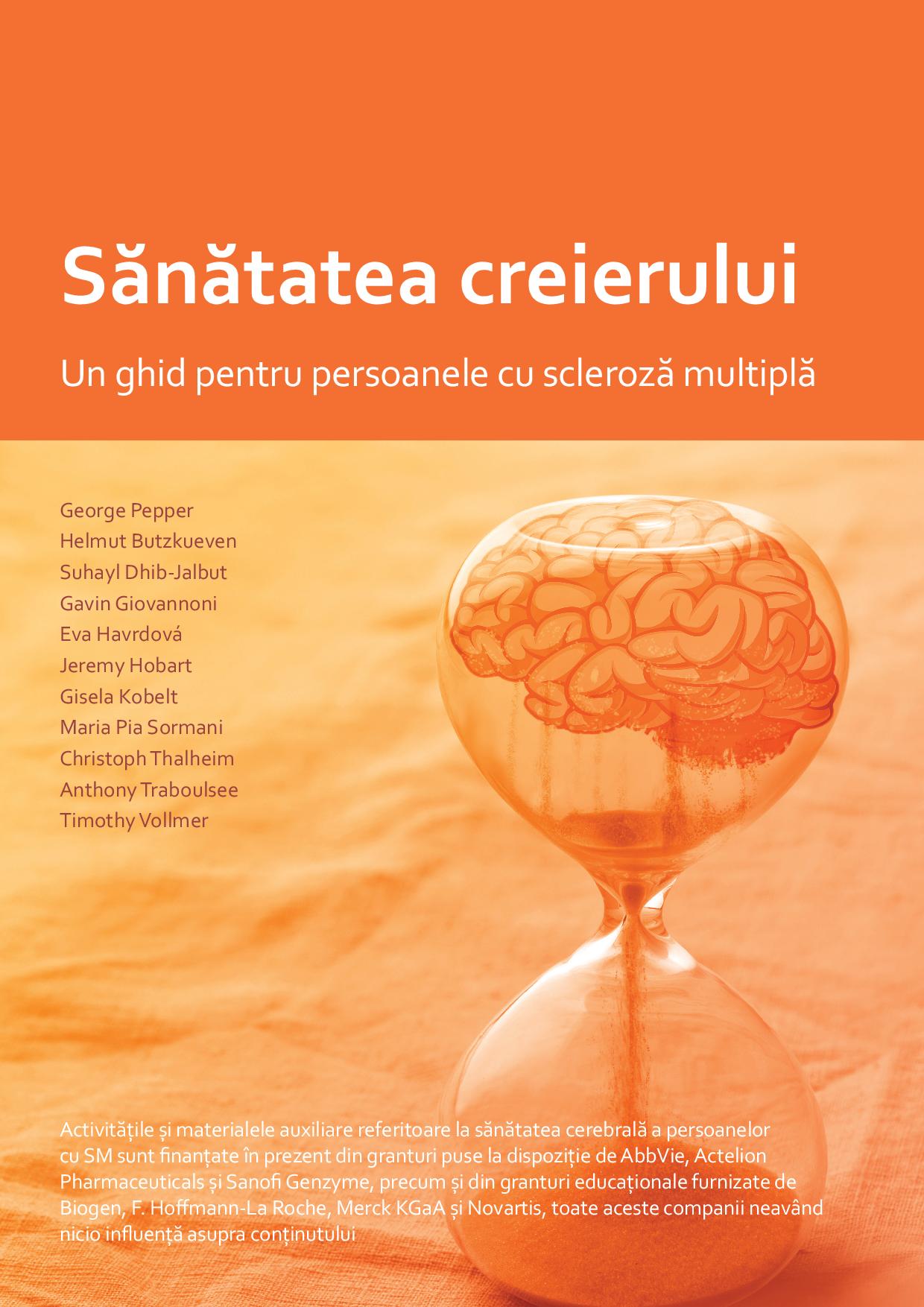 Citat: ”Acest scurt ghid reprezintă o resursă pusă la dispoziţia persoanelor cu scleroză multiplă (SM), pentru a le ajuta să înţeleagă cum îşi pot menţine creierul cât mai sănătos posibil şi cum pot solicita cel mai înalt standard de îngrijire posibil din partea profesioniştilor din domeniul medical. Conţine explicaţii privind modul în care persoanele cu SM pot pune în practică recomandările din raportul „Sănătatea creierului: timpul este important pentru scleroza multiplă”. Ghidul şi raportul au fost elaborate de un grup internaţional de persoane cu experienţă în ceea ce priveşte realitatea vieţii cu SM. Grupul a inclus persoane cu SM, reprezentanţi ai unor organizaţii de pacienţi, medici, cercetători, asistenţi de specialitate şi economişti din domeniul medical. Recomandările grupului constituie o strategie terapeutică care include: „ adoptarea unui stil de viaţă sănătos pentru creier, inclusiv tratarea altor afecţiuni (pagina 3) „ un plan de monitorizare a evoluţiei bolii SM pentru a putea evalua dacă tratamentul dă roade (pagina 4) „ luarea unor decizii informate, de comun acord (pagina 5) „ trimiterea urgentă la un neurolog şi diagnosticarea promptă (pagina 6) „ tratamentul precoce prin intermediul unei terapii de modificare a bolii (TMB), dacă este posibil (pagina 6) „ înţelegerea importanţei sănătăţii creierului pe parcursul tuturor etapelor bolii (paginile 7–8).”